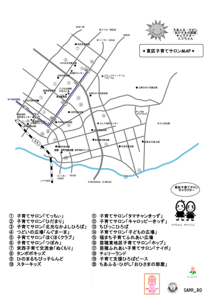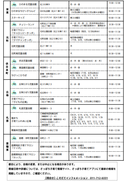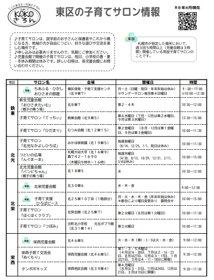 東区の子育てサロン情報「KOKOさろん」 東区にある子育てサロンの一覧です。 この記事に関するお問い合わせ先 札幌市東区保健福祉部健康・子ども課子育て支援担当係〒065-0010 札幌市東区北10条東7丁目1-20保健センター1階電話番号:011-712-6331ファクス番号:011-712-0874問い合わせフォーム 更新日:2025年04月01日