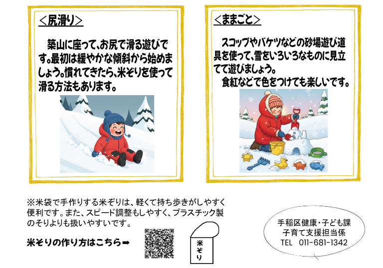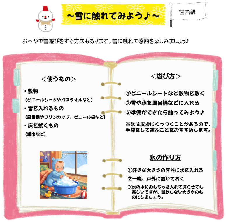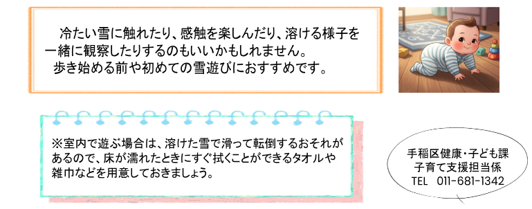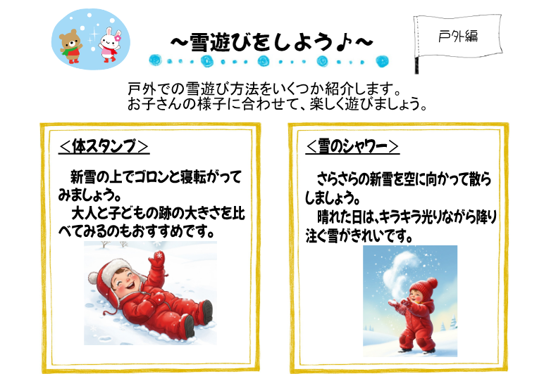 北海道の冬といえば雪!寒さに負けず、冬ならではの遊びを楽しみましょう。室内や戸外での冬遊びのヒントをお知らせします。